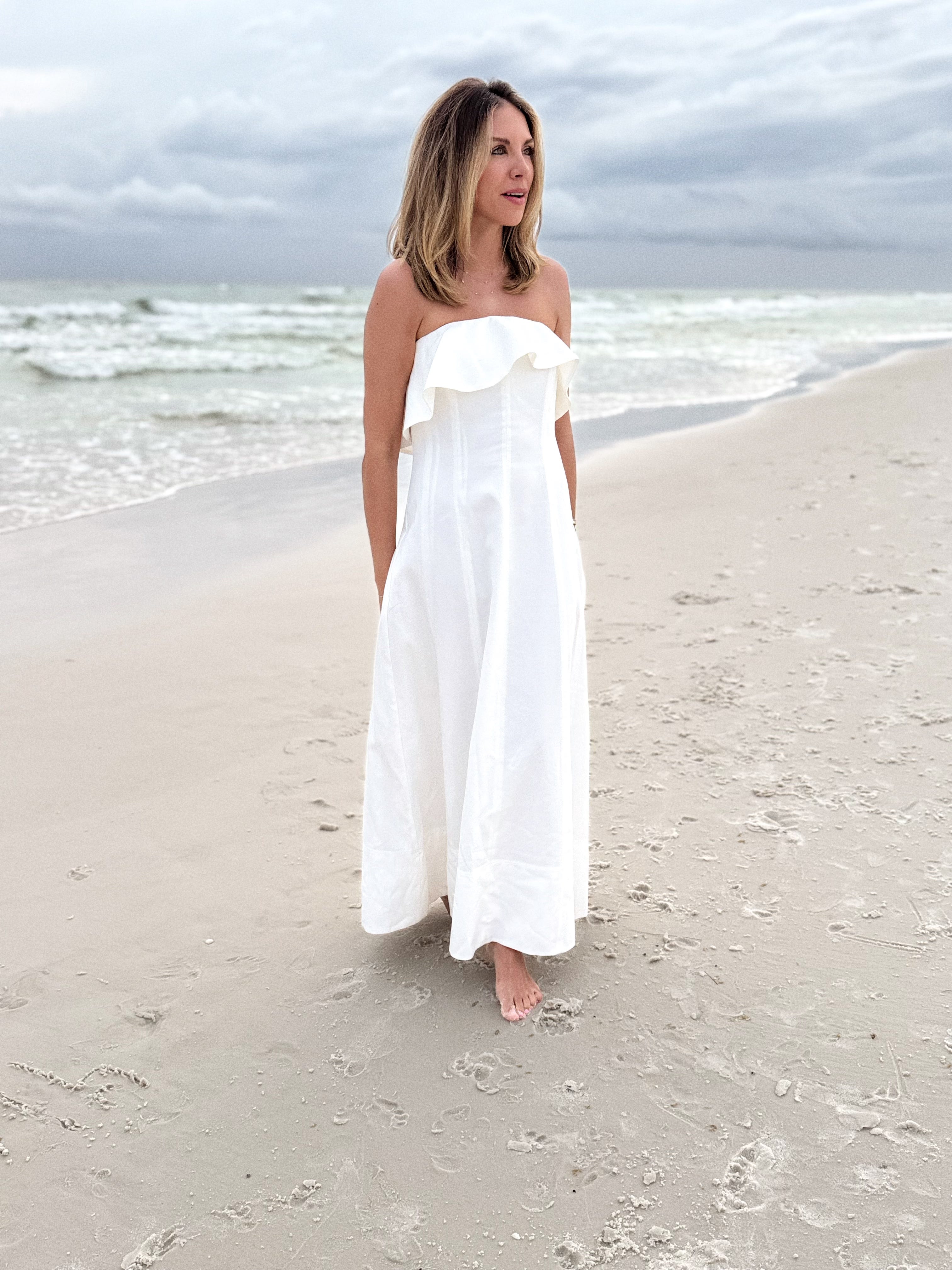 I wore this linen blend strapless maxi dress for our family beach photos and loved it. The built-in bra makes it vacation-friendly and easy to wear. It’s one of those rare pieces that can go either way— dressed down or elevated in seconds.