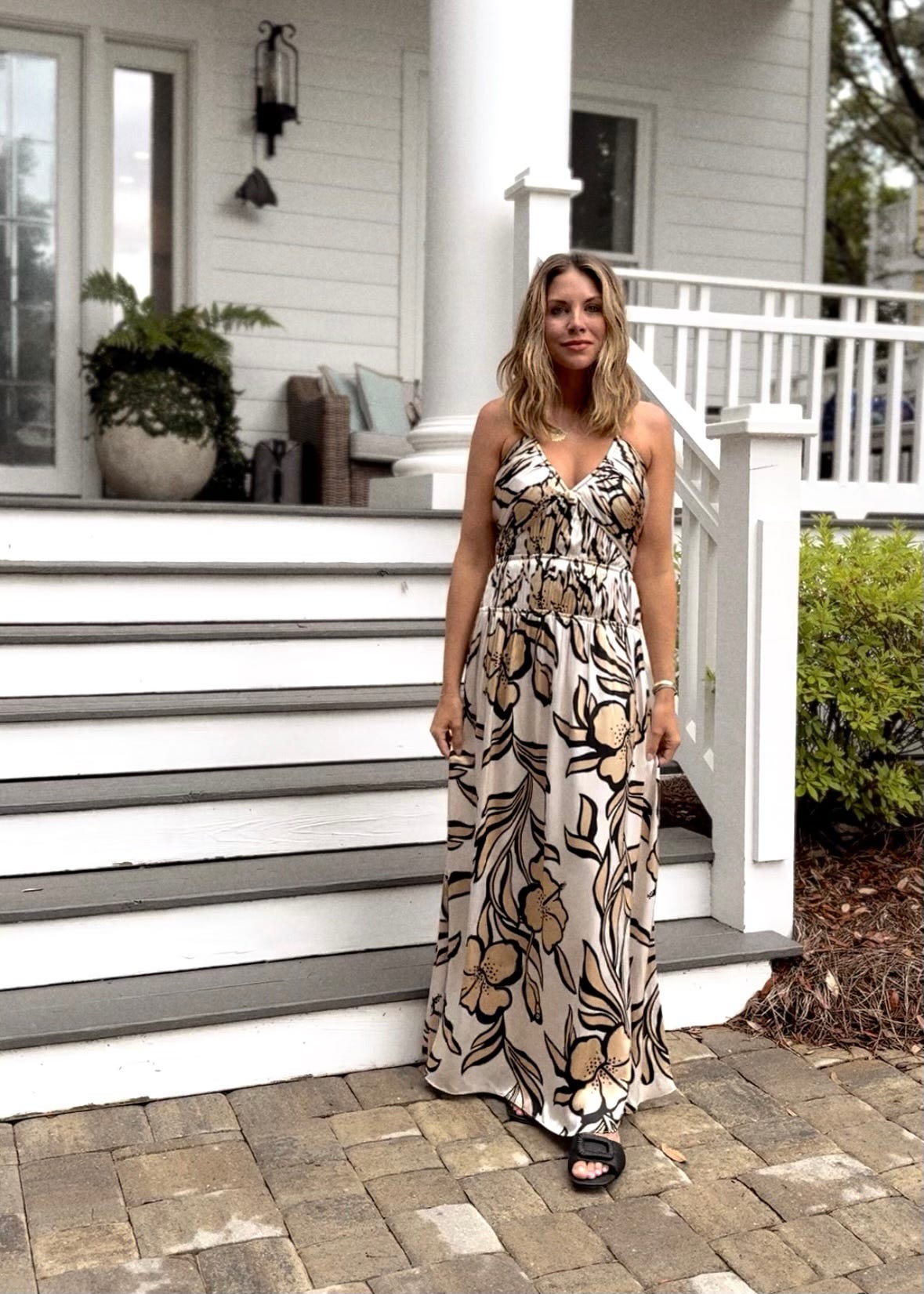 Satin Floral Halter Maxi Dress | Modern Strappy Slides