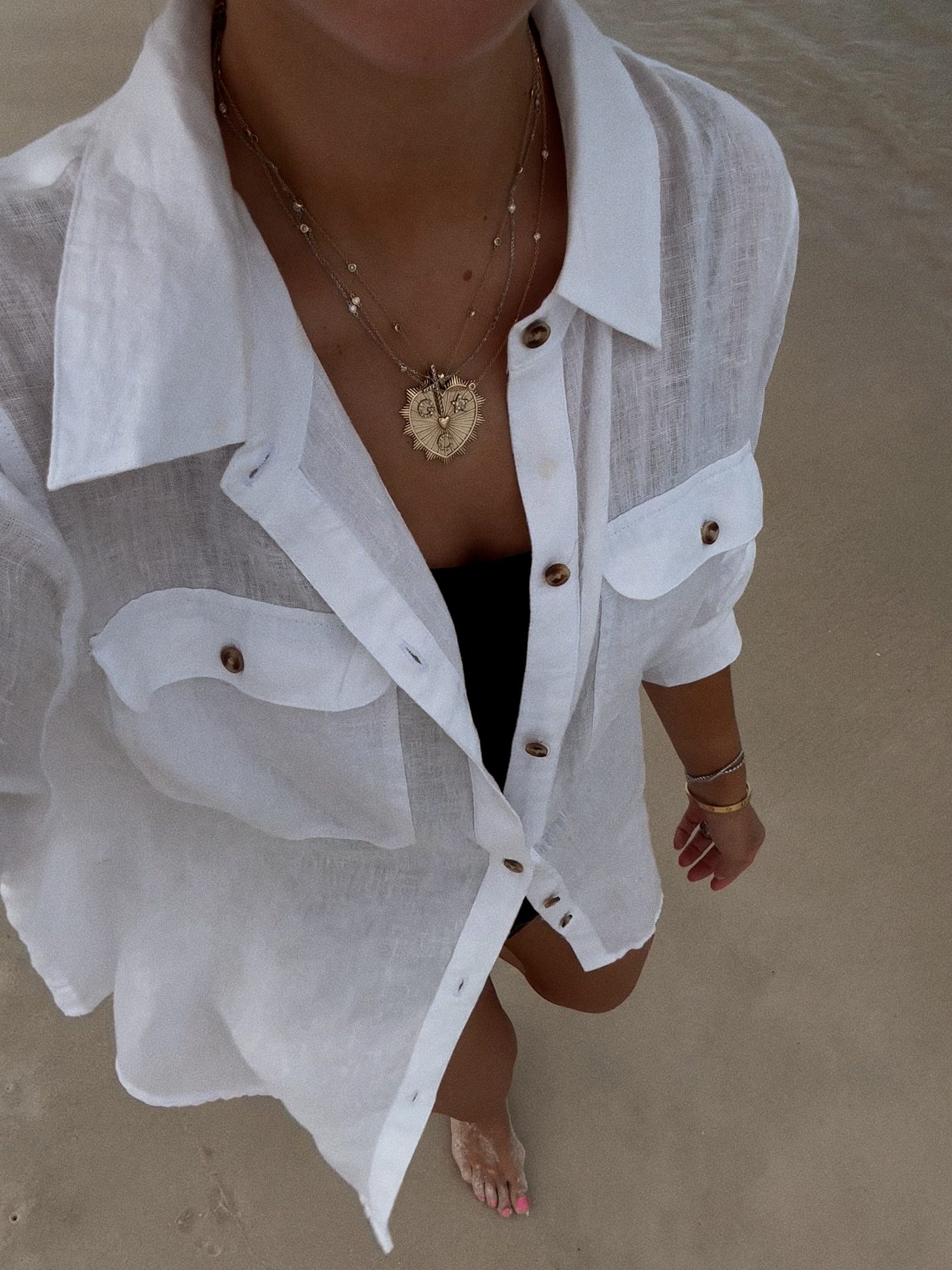 A linen button-down shirt (Size up for the oversized fit— I’m in a large) is my go-to swim coverup— easy, lightweight, and just undone enough to feel chic. I throw it over a suit with sandals and sunglasses, and it instantly pulls the look together without overthinking it. It’s the kind of piece that works just as well heading to the pool as it does grabbing lunch after.