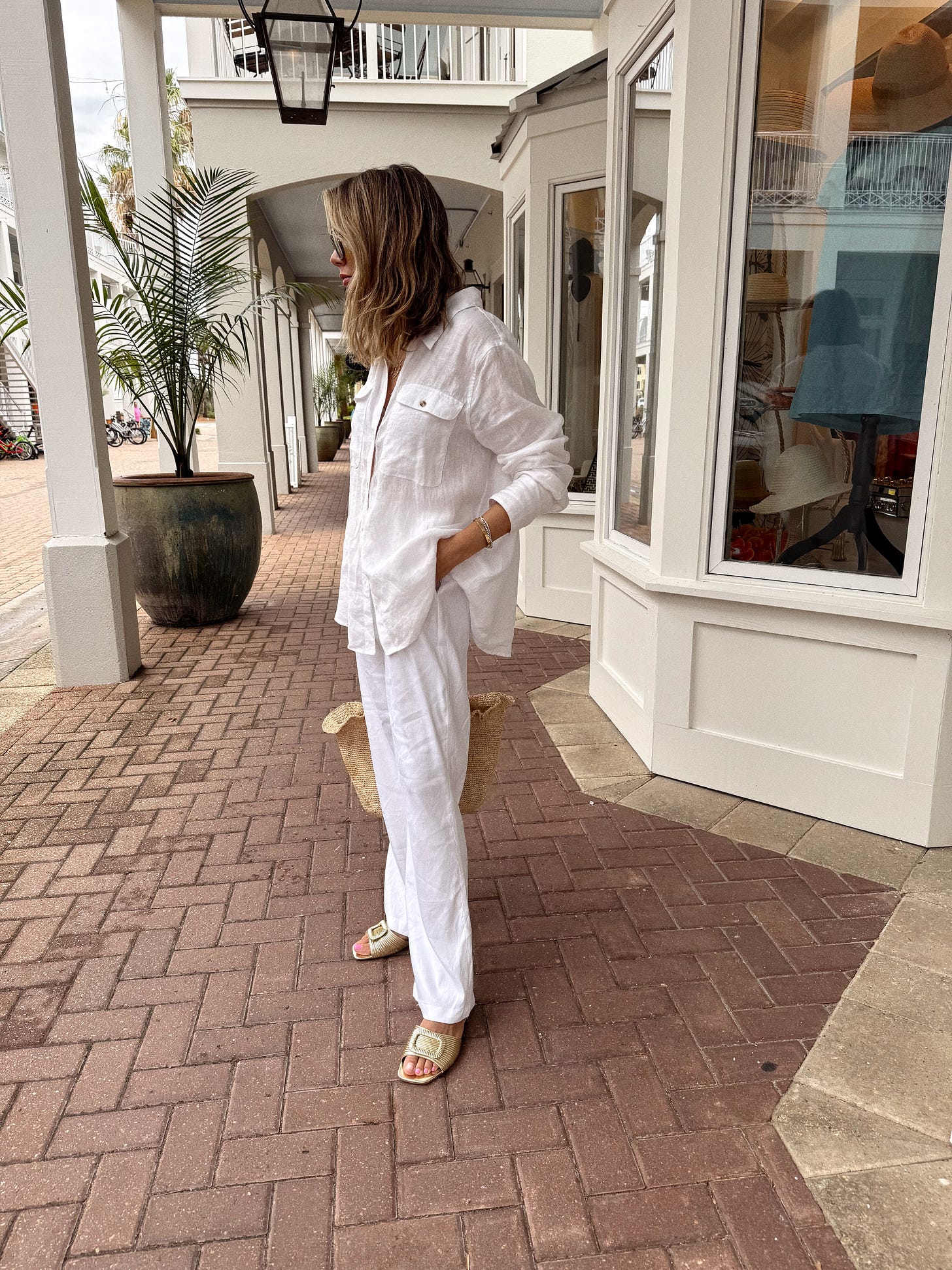 Linen Button Down Shirt | Everyday Linen Trouser | Gold Strappy Slides