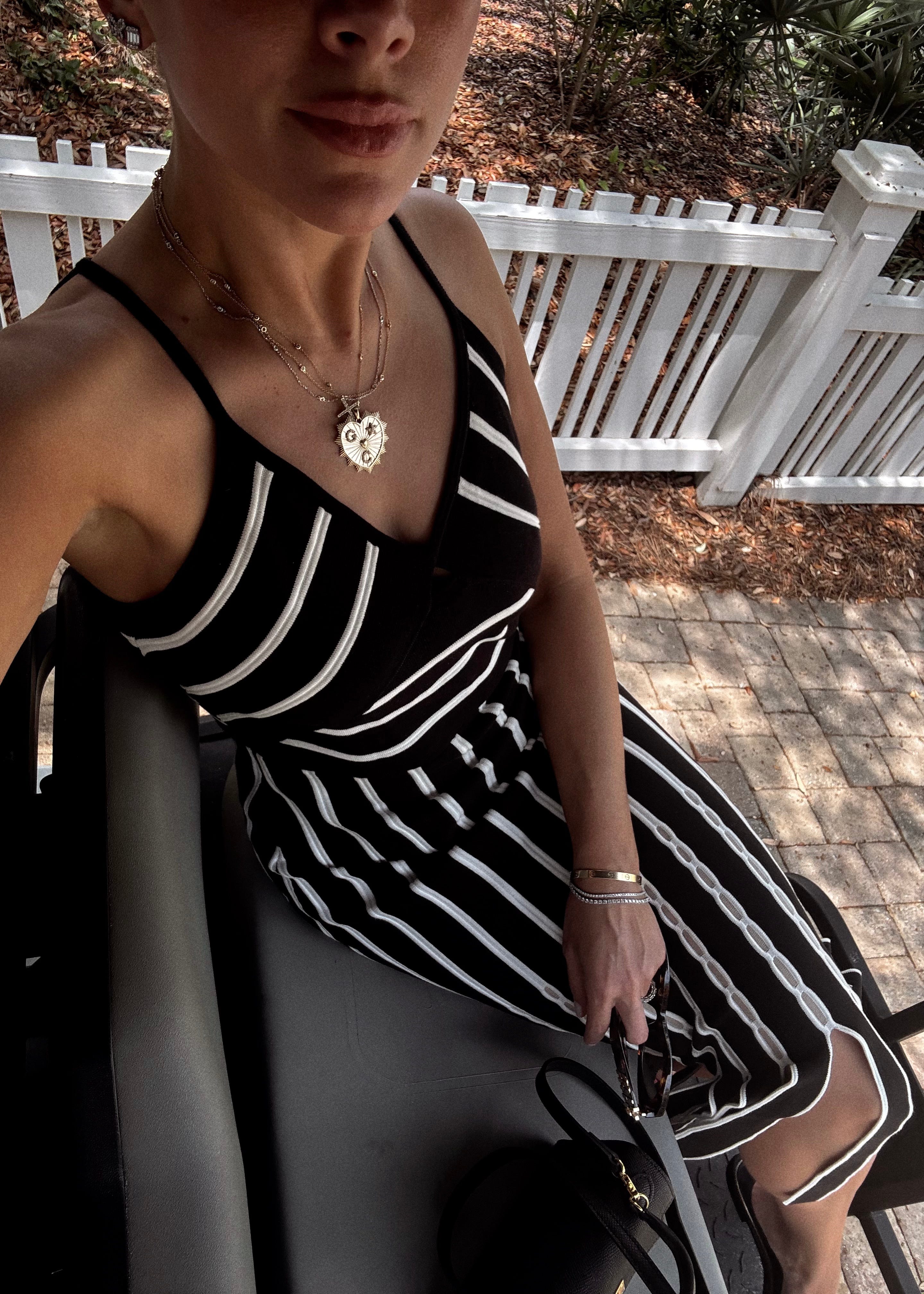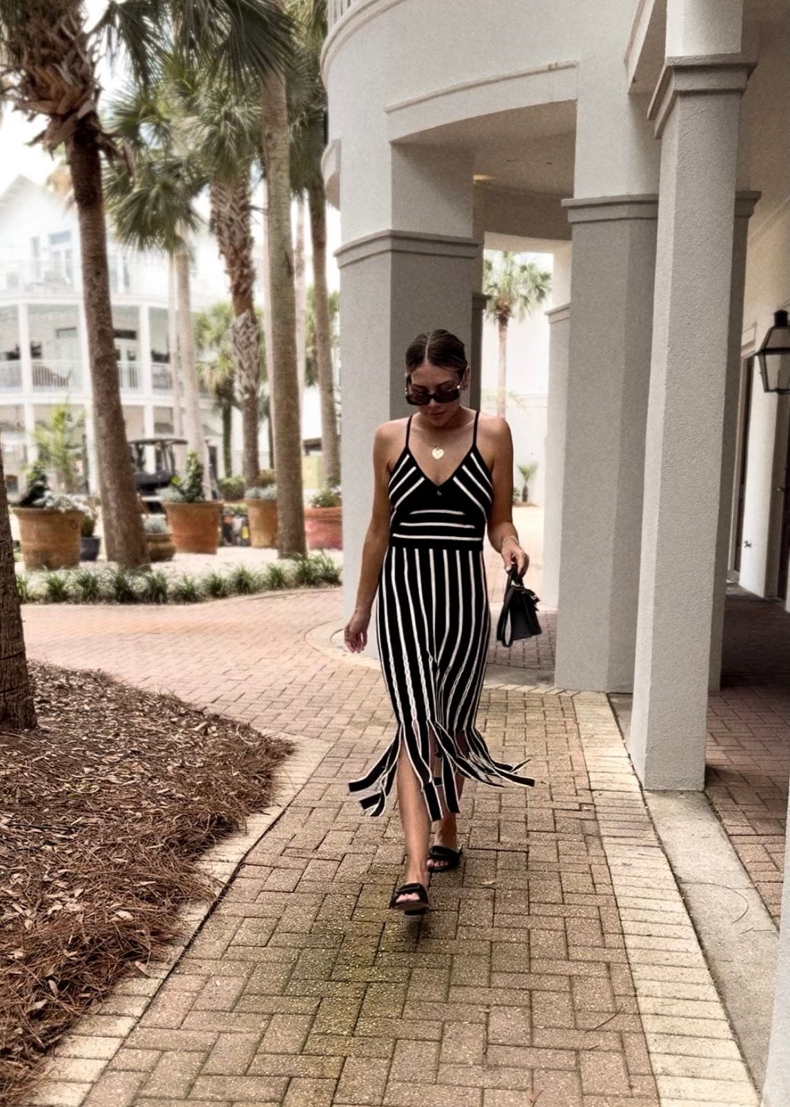 This halter sweater dress is the definition of vacation ready— easy to slip on, with just enough fringe to make it feel special. The texture gives it shape without feeling too structured. I wore it with these modern strappy slides for dinner and received so many compliments.
